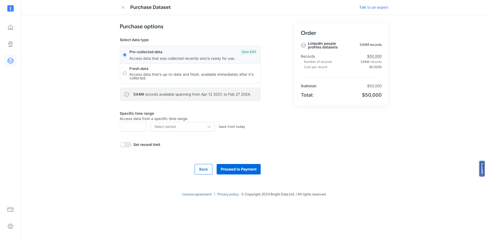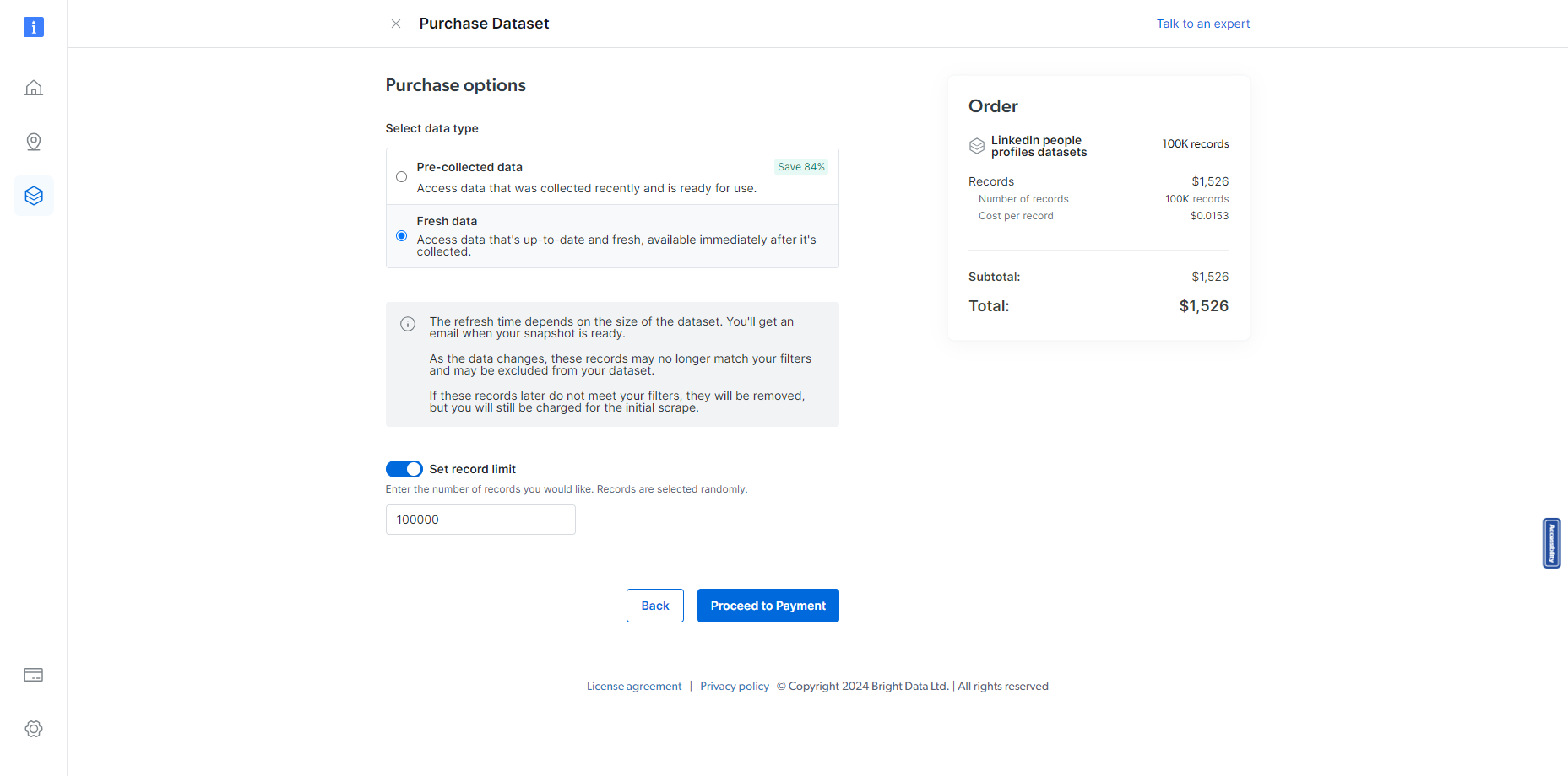 - 设置记录限制-输入您想要的记录数量。 记录是随机选择的。 请注意,价格将根据记录数量而变化。