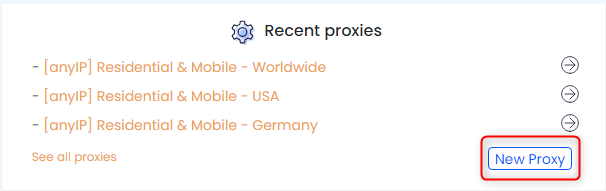 Follow these steps to integrate Bright Data with StablerSOLO’s: Step 1. Access StablerSOLO’s Proxy Configuration 1. Log in to your StablerSOLO account. 2. From the main dashboard, scroll to the Recent Proxies section at the bottom. 3. Click on the New Proxy button to open the proxy configuration window.