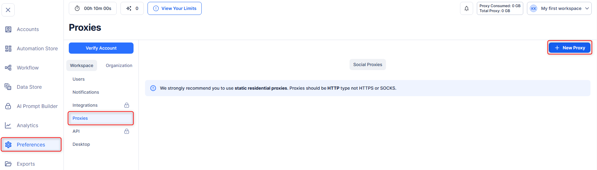 Follow these steps to connect Bright Data to TexAu: Step 1. Log In to TexAu 1. Visit the TexAu website and log in to your account. 2. Navigate to the Dashboard to access your automation tools. Step 2. Open Proxy Configuration Settings 1. From the Dashboard, go to Preferences the left-hand menu. 2. Select the Proxies tab to open the proxy configuration page and click New Proxy to start the configuration.